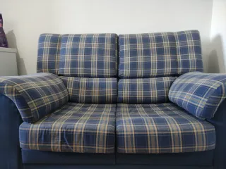 Acogedor sofá de dos plazas con un diseño clásico de cuadros. Buen estado. - Tapicería de tela. - Diseño de cuadros en tonos azules y beige. Entrega en mano