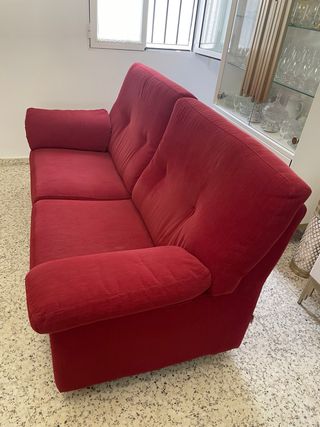 Conjunto de sofás de tres y dos plazas en un color rojo. Son cómodos y están tapizados en tela. - Sofá de 3 plazas. 1.93m de largo - Sofá de 2 plazas. 1.70m de largo