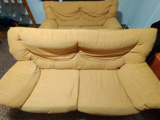 Sofa de dos plazas con funda amarilla y detalles marrones. Se incluyen dos cojines. El sofá está en buen estado, aunque presenta algunos signos de uso. - Medidas aproximadas: 1.40m de ancho x 0.80m de profundidad x 0.80m de alto. - Perfecto para espacios pequeños. - Ideal para una o dos personas.