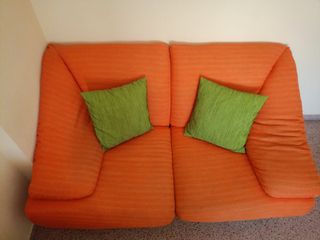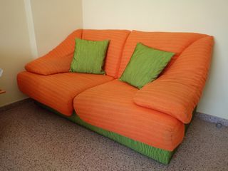Sofá de dos plazas, extensible, en color naranja y marrón. Está en buen estado y es muy cómodo. Marca Pedro Ortiz. Tela resistente y lavable. Todas las partes son desenfundables. En mi perfil también tengo a la venta otros muebles que podrían interesarle