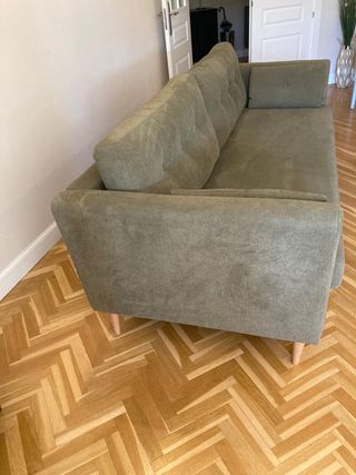 Sofá de cuatro plazas en un bonito tono verde vintage. Se encuentra en perfecto estado, con muy poco uso, está como nuevo. Dispone de dos cojines traseros grandes y dos pequeños laterales, ambos con cremallera para poder lavar. El asiento también dispone de cremallera.