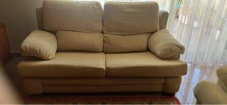Sofá de 3 plazas (con 2 cojines grandes) y sofá de 2 plazas. El respaldo tiene movimiento en tres posiciones y uno de los reposabrazos también tiene tres posiciones. La tapicería es de tela beis y la parte de los cojines lleva cremallera para poder desmontarlo. Recogida, carga y transporte a cargo del comprador. Medidas: Sofá grande:200x85x90cm Sofá pequeño:160x85x90cm