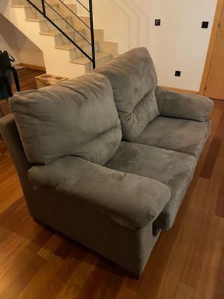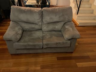 Sofá de dos plazas en color gris, con un tacto suave y agradable. Muy cómodo y sin desgaste de asientos. - Tapicería de tela y ante. - Diseño moderno y confortable. - Medidas: 165 aprox de largo, 82 de alto, 83 de ancho y con asientos extendidos 125 aprox. - Contiene 3 pequeños defectos imperceptibles de desgaste y de traslado por mudanza. - Fundas desmontables y lavables. - Se limpian fácil las manchas (trapo húmedo). Venir a recoger. Se vende por haber comprado sofá nuevo.