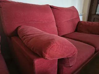 Sofás de tres y dos plazas en color granate, con un diseño clásico. Tienen aproximadamente 20 años de antigüedad y se encuentran en buen estado, aún se pueden usar. - Tapicería de pana. - Estructura robusta. SOLO PARA RECOGER, NO SE HACEN ENVÍOS. SE VENDEN EN CONJUNTO.
