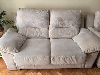 Sofá de 2 plazas en color beige. Tapizado en tela tipo chenilla, suave al tacto y agradable. Asientos y respaldo firmes, sin hundimientos. Ideal para pisos pequeños, habitaciones o como sofá auxiliar. Medidas aprox.: 140 × 90 × 60 cm. Buen estado general. Recogida en mano.