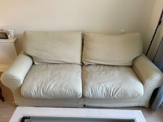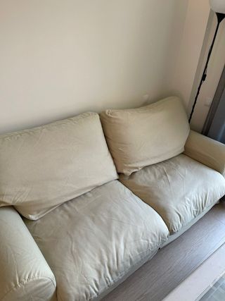 Sofá de dos plazas en color beige, modelo LINANAS. Realmente solo se ha usado para que duerma el gato y poner ropa encima. Tiene una mancha en el centro del asiento que no he intentado limpiar. Mi gato se ha desahogado un poco con los apoyabrazos.