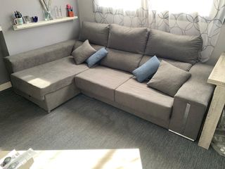Sofá chaise longue de tres plazas en color gris, tapizado en tela anti manchas suave al tacto. En perfecto estado, tan solo 7 meses de uso. - Chaise longue de 150cm - Ancho asientos 73cm - Espacio de almacenamiento bajo el chaise long y en los brazos. - Asientos móviles hasta 85cm (50cm con los asientos metidos). - Incluye dos puffs (recogidos en uno de los laterales) y dos cojines decorativos.