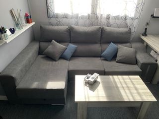 Cómodo sofá modular de tres plazas. Aunque no está en perfectas condiciones aún le queda uso. Tiene almacenaje debajo del chaiselonge. Los asientos se abren haciendo el sofá más amplio para poder dormir. Dispongo de ascensor. Imprescindible dos personas para transportarlo. - Tapicería de tela. - Cojines en dos tonos: gris y blanco.