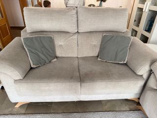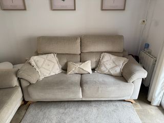 Se vende juego de dos sofás en color beige, prácticamente nuevos. - grande: 3 plazas y extraíble largo: 1,90 fondo: 96 -pequeño: 2 plazas largo: 1,55 fondo: 92 No llegan a 3 años de uso,cuidados y limpiados semanalmente. la tela es de color beige arena antimanchas. Ideal porque con un trapo con agua saltan todas las manchas, chocolate, grasa... todo.(yo le doy con un poco de amoniaco para limpiarlo mejor)
