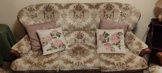 Sofá 3 plazas y 2 sillones madera y tela