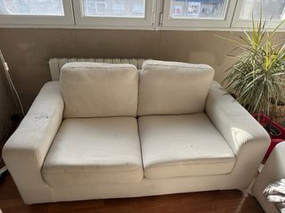 Sofá de dos plazas de gran tamaño en color beige. Es cómodo y espacioso. - Tapicería de tela. - Requiere lavado. El sofa no esta NADA desgastado ni pelado, ni rozado. Esta en perfectas condicones, es lavar lo que hay que hacerlo