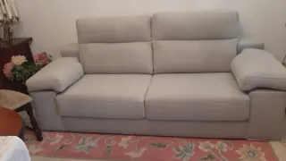 Vendo dos sofás muy cómodos y en excelente estado. • Sofá de 3 plazas: 1,90 m de largo x 96 cm de fondo. • Sofá de 2 plazas: 1,60 m de largo x 93 cm de fondo. El sofá de tres plazas tiene cojines extraíbles que permiten convertirlo fácilmente en un estilo cama. Ambos cuentan con patas de madera, lo que los eleva del suelo y facilita la limpieza debajo. La tela es beige, de tejido antimanchas, perfecta para mantenerlos impecables. Están prácticamente nuevos, muy cuidados y listos para llevar.