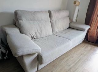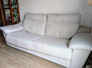Sofa de dos plazas,asientos extensibles individualmente desde 45 cm hasta 70 cm. Buen estado, siempre ha estado cubierto por fundas. Color beige jaspeado. Cabecero modulable individualmente. Fundas lavables y desenfundables. Se puede ver sin problema.