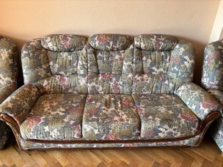 Este conjunto de sofá y sillones aporta un toque clásico y acogedor a tu salón. El diseño floral le da un aire vintage único. - Sofá de varias plazas. - Dos sillones individuales a juego. - Patas de madera oscura.