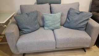 Sofá de dos plazas muy cómodo y en muy buen estado. Asientos deslizantes. Su diseño moderno y su tapizado lo hacen ideal para cualquier salón. - Tapizado en tela. - Color verde azulado. - Dos plazas.