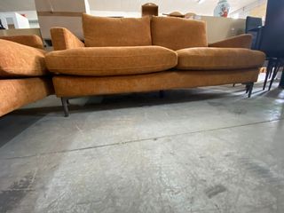 Sofá de dos plazas de color entre camel y sepia, de tacto agradable. Es perfecto para un espacio pequeño. Nuevo a estrenar