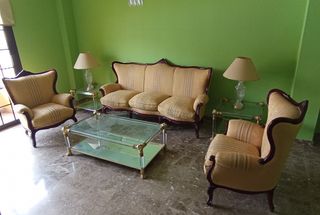 Salón Completo con Un sofá de 3 plazas y dos de 1 plaza Estilo Luis XV. Dos mesas auxiliares y una de centro y dos Lámparas de mesa