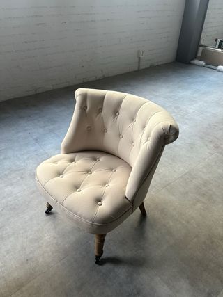 Vendo conjunto de sillones Sklum en muy buen estado: dos sillones individuales y un sofá de dos plazas. Tapizado claro con diseño capitoné, elegantes y cómodos. Perfectos para salón, despacho o sala de espera. La mesa de la foto no está incluida. Se vende el conjunto o también por separado (precio diferente). Medida sillón individual: ancho60cm/alto65 Medida sofá: ancho127cm/alto73cm