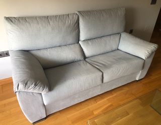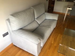 Sofá de dos plazas confortable. - Tapicería en tela de color beige. Tiene protector en los laterales contra los arañazos de los gatos. Tiene en el centro algunos hilos sueltos, pero nada grave. Las medidas son aproximadas. Cualquier cosa no dude en preguntar.
