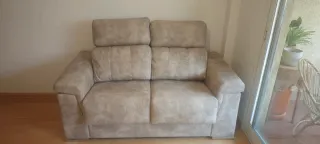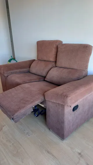 Cómodo sofá de dos plazas en muy buen estado. Su diseño moderno y su tapizado lo hacen ideal para cualquier salón. las plazas del sofá se abren para que sea más ancho. Cabeceros reclinables. 60 cm sofá cerrado, y 85 cm abierto. - Tapizado en tela. - Color marrón. - Dos plazas. Medidas aproximadas. IMPRESCINDIBLE VENIR A RECOGER