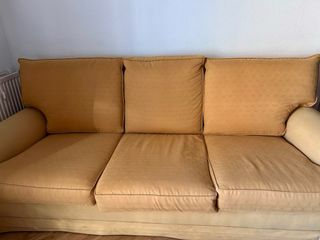 Cómodo sofá de tres plazas, ideal tanto para pasar el rato viendo una película como para echarse la siesta. Tela mostaza/amarillo. Cojines de plumas. Estructura robusta. Hecho por un artesano, estructura única y robusta. Precio original del sofá: 1.110 euros. Tengo otro sillón individual en mi perfil que va a conjunto por 10 euros. Por la venta de los dos dejo este último a 5 euros. Total dos piezas: 85 euros. Precio original del sillón: 400 euros.
