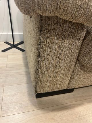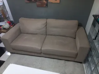 Sofá de tres plazas en color arena, con muy poco uso. - Tapicería de tela. -Sofa robusto. - Diseño moderno y confortable. -Cojines lavables -Menos de dos años de uso -Daños esteticos en la foto.No se aprecia al estar debajo de los cojines URGE