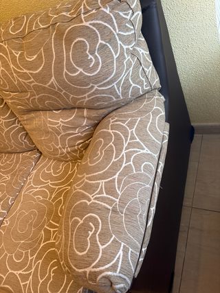 Acogedor sofá de dos plazas,con funda. - Tapicería de tela. - Yo lo tenía con la funda reversible que se muestra (rosa y blanco) o (blanco y rosa) que es super bonita y le da un aspecto muy cálido y bonito como se muestra en las fotos. Incluye tb de cojines de las fotos -Se recoge en Loranca (Fuenlabrada)