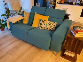 Sofá de dos plazas con un diseño moderno y confortable. - Cabeceros reclinables para mayor comodidad. - Tapicería en tela de color azul verdoso y cojines amarillos. - Patas metálicas plateadas.