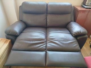 Sofá relax de dos plazas en piel sintética marrón. Está en muy buen estado y es muy cómodo. - Mecanismo reclinable. - Asientos amplios y confortables.