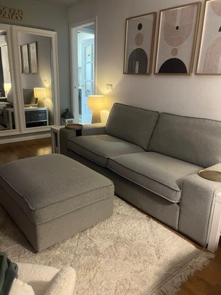 Sofá de tres plazas de Ikea modelo kivik y reposapiés.Su diseño moderno y cómodo lo hace ideal para cualquier salón. Tiene dos fundas completas. La que está puesta y la Skiftebo, que es la gris oscura. Regalo par de cortinas grises y las mesitas que tiene puestas en los lados del sofá. - Tapicería de tela. - Color gris claro. NO VENDO POR SEPARADO