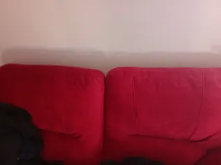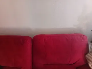 Sofá de tela en color rojo. Muy cómodo y añade un toque de color a cualquier estancia. - Tapicería de tela. Líneas rojas y negras. - Diseño de dos plazas. El primero (1° foto) mide: ancho 210, fondo 110 y alto 100. Son dos plazas grandes entran tres/cuatro personas. Hay hilos sueltos en alguna esquina.