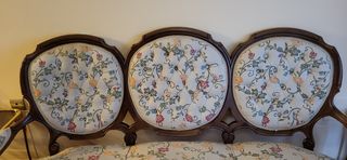 Precioso sofá de tres plazas estilo Luis XV, con dos butacas a juego con tapicería floral multicolor y estructura de madera. Es una pieza elegante y con un diseño encantador. - Tapizado con un estampado floral delicado. - Estructura de madera oscura, pulida. - Diseño de respaldo con tres paneles ovalados.