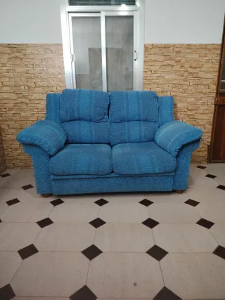 Preciosa combinación de sofá de dos plazas y sillón individual. Ambos tapizados en tela de color azul, con un diseño elegante y atemporal. - Sofá de dos plazas cómodo y espacioso. - Sillón individual con respaldo alto. - Perfecto para salón o sala de estar. Muy buen estado Posibilidad de vender por separado