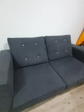Sofa cama de tres plazas en color gris, de tela. Es un sofá cómodo y espacioso, ideal para relajarse. Se conserva muy bien ese a su uso, es antimanchas y se puede lavar con agua perfectamente. Mide 266cm de largo / 100cm de ancho /90 cm de altura. También se pueden sacar los tres cojines para convertirlo en una cama, entonces alcanza 130cm de ancho (La segunda foto es del sofá convertido en cama). También está la opción de sacar un modulo para hacer el sofá de dos plazas, en las fotos de la parte trasera se puede ver la separación. Entrega en mano en San Sebastián de los reyes, el comprador se encarga de la recogida completa.