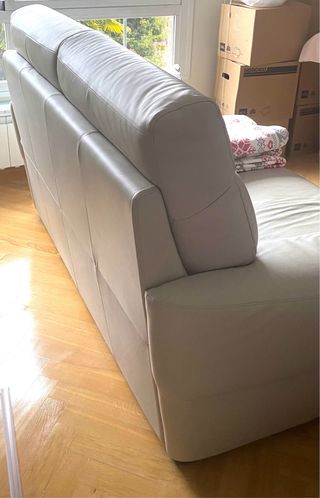 Sofá eléctrico de dos plazas amplias en color beige. - Tapicería de piel. - Mecanismo de reclinación eléctrica. Es un sofa muy cómodo de buena calidad. Tiene una marca de pintura y la piel agrietada, por eso tiene un parche. Lo usamos con funda y no se nota nada. Funciona a la perfección. Para recoger a principios de Febrero