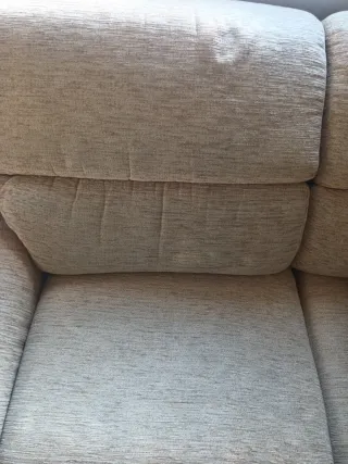 Sofá eléctrico de dos plazas amplias en color beige. - Tapicería de piel. - Mecanismo de reclinación eléctrica. Es un sofa muy cómodo de buena calidad. Tiene una marca de pintura y la piel agrietada, por eso tiene un parche. Lo usamos con funda y no se nota nada. Funciona a la perfección. Para recoger a principios de marzo aproximadamente.