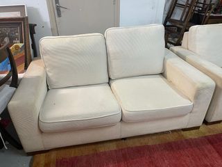 Sofa de dos plazas en color beige, de tela. Medidas aproximadas: 160cm de ancho x 90cm de profundidad. Se encuentra en buen estado. Totalmente desenfundable, cojines y estructura. Lavable. Tengo 1 unidad. - Cómodo y espacioso - Ideal para espacios pequeños - Diseño sencillo y elegante