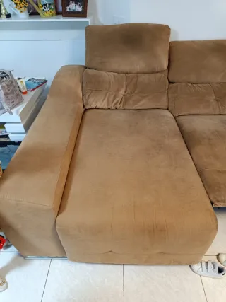 Sofá de tres plazas con acabado en polipiel. Presenta deterioro en el material. No se ha usado por lo que la estructura interna y cojines está intacta. Se vende porque no lo usamos y no queremos tapizarlo. Los dos asientos extremos poseen reposapiés extensible. - Color marrón - Material: polipiel.