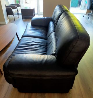 2 sofas de cuero negro uno de 3 plazas(2.20m) y otro de 2 plazas (1.80m). Están en buen estado, aunque presentan marcas de uso. - Amplias plazas. - Diseño clásico.