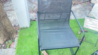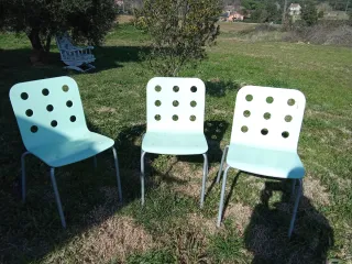 3 sillas de jardín con un diseño elegante y resistente. - Asiento con patrón de rejilla. - Patas curvas para mayor estabilidad. - Respaldo curvo. 5€ cada una.
