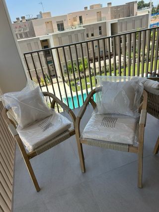 Vendo pack de 2 sillas de jardín Sklum modelo Dubai, de estilo premium, fabricadas en madera de acacia maciza con acabado cepillado, resistente y elegante. Incorporan cojines desenfundables de alta calidad en poliéster (respaldo de fibra y asiento de espuma de alta densidad) que garantizan gran confort. Su diseño combina líneas modernas con cuerda trenzada artesanal en los reposabrazos y tacos de goma para máxima estabilidad. Perfectas para crear un ambiente sofisticado en terraza o jardín. Excelente estado.