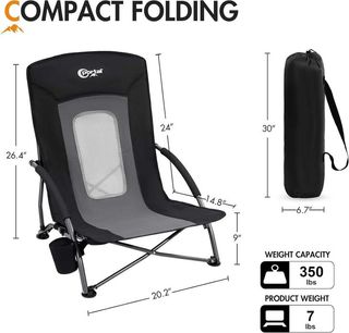 Silla de camping ultraligera, perfecta para llevar a cualquier parte. Su diseño combina comodidad y portabilidad. - Estructura de metal resistente. - Asiento y respaldo de tela. - Altura del asiento: 20 cm. - Incluye bolsa de transporte. - Capacidad de carga: 120 kg. - Material de la funda: 100% poliéster (600D Oxford). - Material de las varillas: acero - Tamaño: 58 x 55 x 60 cm. - Tamaño del paquete: 65 x 17 cm. - Ancho del asiento: 50 cm. - Altura del asiento: 22 cm. - B0CVQLHB53