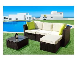 Set made of galvanized steel tube and brown artificial rattan, resistant to climate changes and UVA rays. The sofa comes with thick sponge padded cushions (160g polyester), removable covers The table is high for eating with tempered glass. Includes two poufs with cushion Measurements: - Corner 230x175x 80 and 60 high arm - High table 130x75x70 Two-year warranty. Cash on delivery 672*062*038