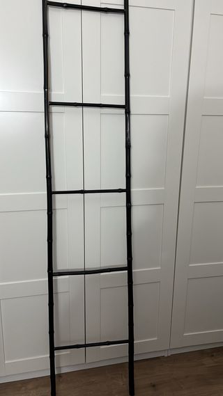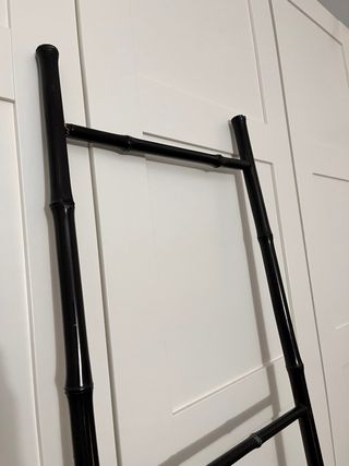 Escalera decorativa con un diseño inspirado en el bambú. Su acabado en color negro le da un toque elegante. - Material: Bambú. - Color: Negro. - Diseño: Escalera decorativa. Puede usarse como toallero en un baño, para colocar las mantas del sofá en salón, colgar bolsos.... Se ha desencolado un lado del peldaño de arriba (última foto), pero de puede arreglar Medidas: ancho 36 cm arriba y 41 abajo alto 1,90 m