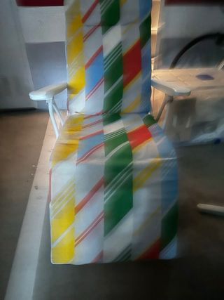 Conjunto de tres sillas plegables, perfectas para disfrutar del sol y de esos atardeceres de la costa dorada en familia - Estructura de metal y plástico. - Asiento y respaldo de tela a rayas. Huesca y Lerida, posibilidad de entrega en mano Pack 25€/ individual 10