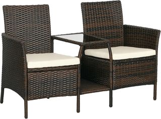 Banco de Jardín de 2 Plazas en Ratán y Acero, Banco de Exterior con Cojines Extraíbles y Mesa con Tablero de Vidrio Templado, Sofá de Exterior, 138X60X87 Cm, Marrón