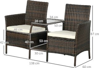 SET DE 2 PIEZAS: Banco de exterior con 2 sillas modernas y mesa de vidrio templado. DIMENSIONES: 138L x 60P x 87A cm, asiento 46L x 49P x 42A cm, capacidad de carga 130 kg. MATERIALES: Ratán PE resistente al agua, estructura de acero pintado en polvo para durabilidad. MESA FUNCIONAL: Tablero de vidrio fácil de limpiar y estante inferior para objetos. CONFORT ACOJINADO: Cojines gruesos con fundas extraíbles para limpieza. Adecuado para jardines, terrazas y espacios interiores. Montaje requerido. Disfruta de tu tiempo al aire libre con estilo y confort.