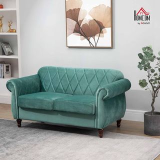 Sofá de 2 plazas en madera y terciopelo verde, con dimensiones de 148L x 72P x 76A cm, diseñado para albergar hasta 200 kg. La estructura es de madera de árbol de goma, con patas redondeadas y reposabrazos amplios. Los cojines del asiento son gruesos, removibles y acolchados en gomaespuma 28D. Cubierto en suave tejido de terciopelo, el sofá presenta un diseño vintage rétro con decoración en rombos. Montaje requerido. Ideal para la sala de estar, combina comodidad y estilo, haciendo que cada ambiente sea único y acogedor. Perfecto para quienes buscan practicidad y diseño.
