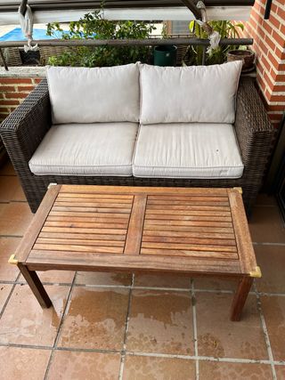 Conjunto de mobiliario para terraza o jardín. - Sofá de dos plazas con cojines alto 72 cm, ancho 1,44 cm - Mesa de centro de madera 1x 0,5 mts