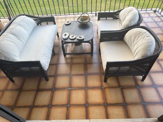 Conjunto de muebles de exterior para disfrutar del buen tiempo. Incluye un sofá, dos butacas y una mesa. - Sofá 180 cm x 80 x 80 - Dos butacas a juego: 90 x 80 - Mesa de centro 140 x 70 - Banquetas adicionales: 45 x 45 Precio negociable